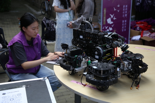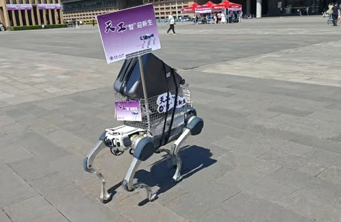 迎新现场最引人注目的“明星”,无疑是无处不在的科技元素。来自杭州云深处科技股份有限公司的四只机器狗与学校再次开发的一只机器狗,轻巧地穿梭于人群之中。它们不仅灵活地帮助新生搬运行李,还不时与大家互动合影,引得现场欢笑不断、掌声阵阵。这些由校友企业研发的四足机器人,不仅是学校人才培养和科技创新实力的生动展示,更成为连接校友情谊与新生期待的特殊纽带。